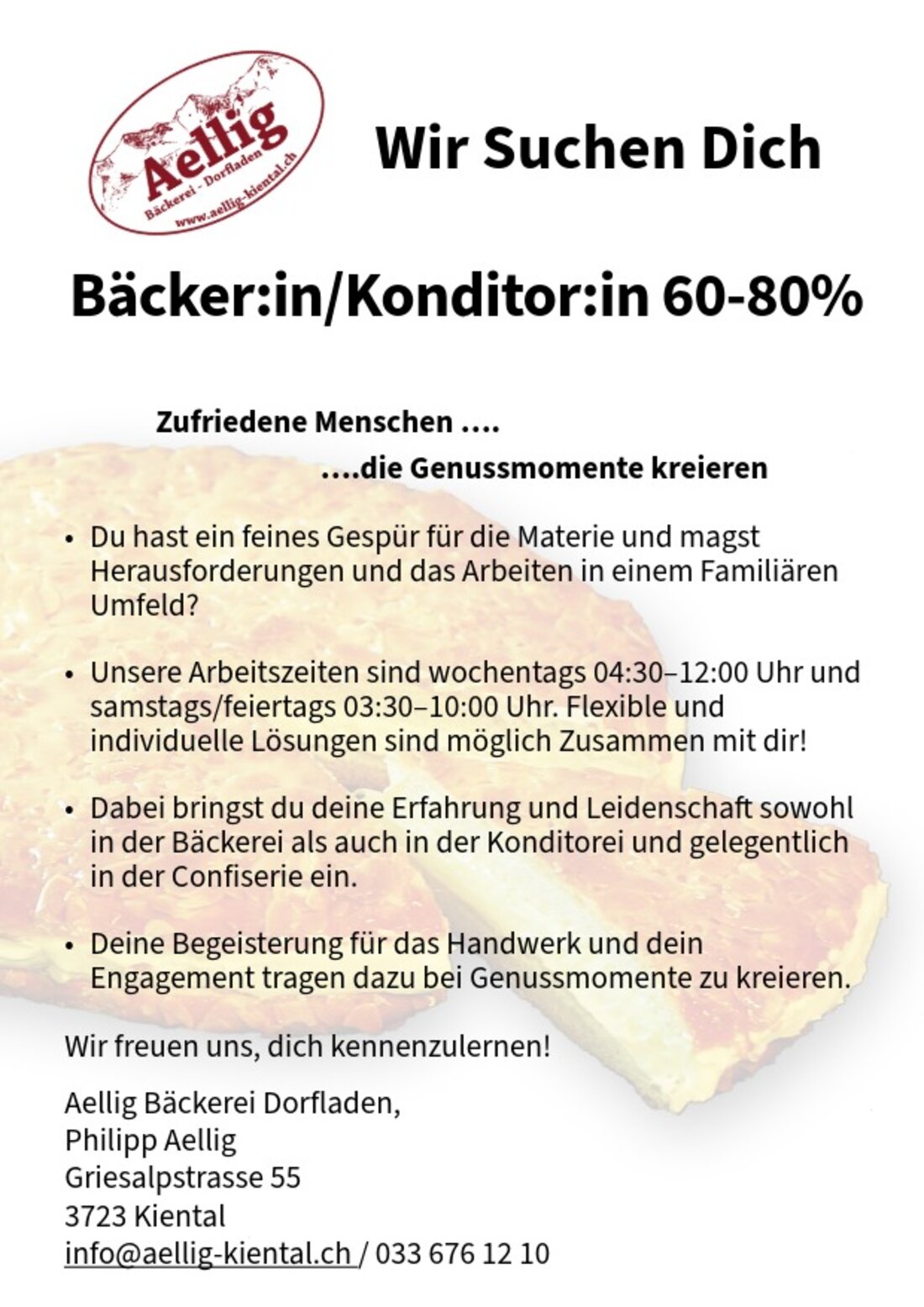 Bei uns, der Aellig Bäckerei Dorfladen, erwarten dich flexible Arbeitszeiten (werktags 05:00–11:00, samstags 03:00–10:00 Uhr), ein unterstützendes Team und die Möglichkeit, dich weiterzuentwickeln. Qualität und Präzision sind dir wichtig?